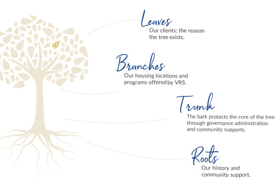 Symbolic to our growth and purpose, the VRS Communities tree represents the various aspects of our organization that work together to serve our communities. The leaves represent our clients and are supported by the branches of our organization as well as the deep roots of what it’s taken us to get here.